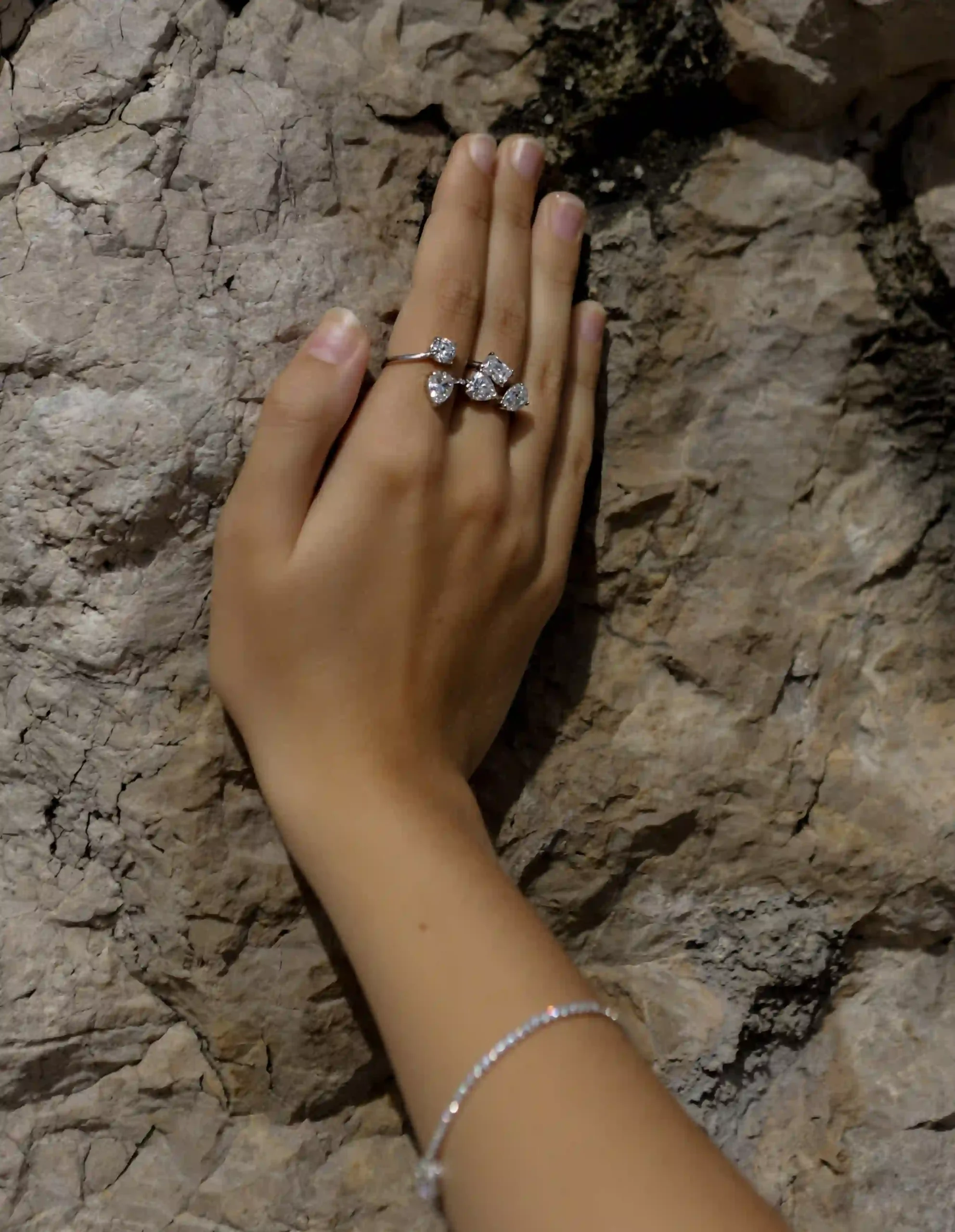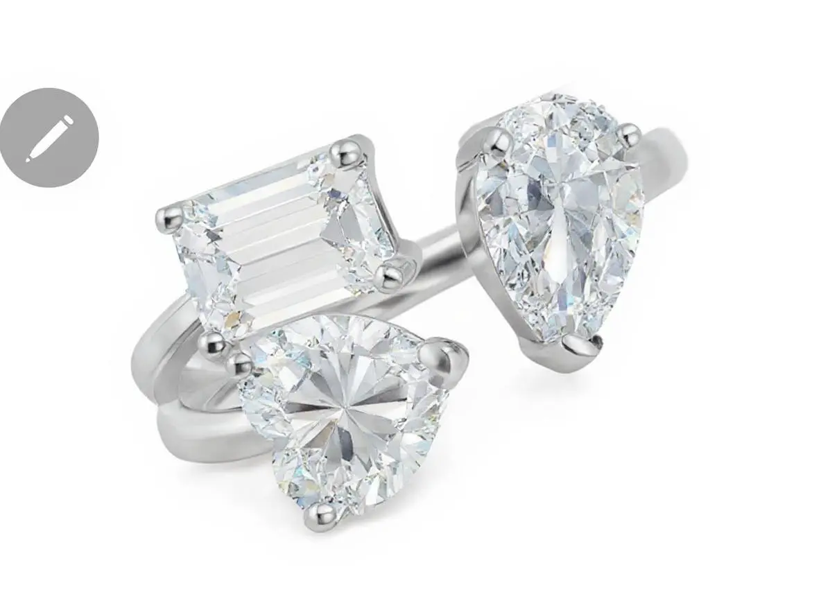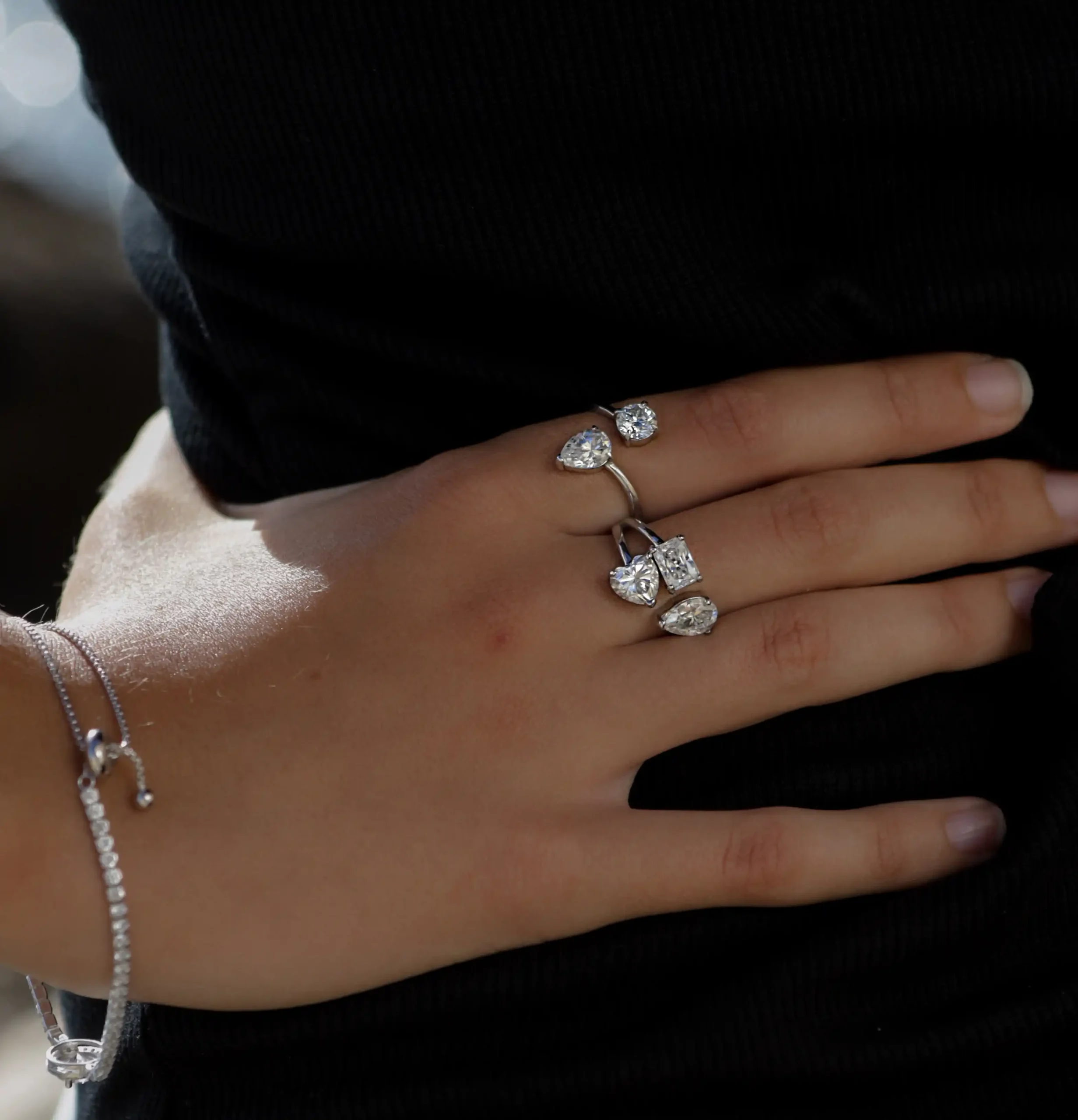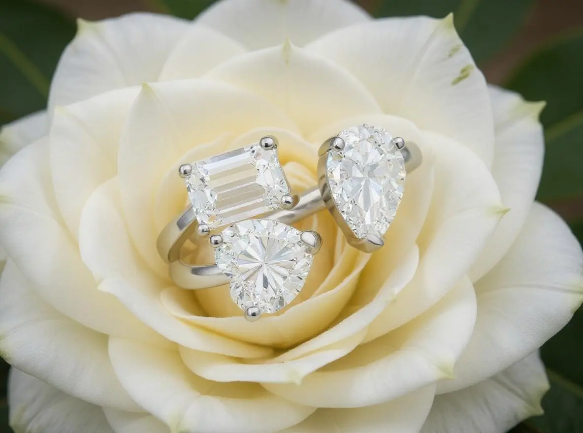Three love-grown stones. Three souls carved in light: Radiant, Heart, Pear. Not chosen to match, but to balance — a rare composition of contrasts in perfect accord. This is not tradition revisited. It is equilibrium redefined.