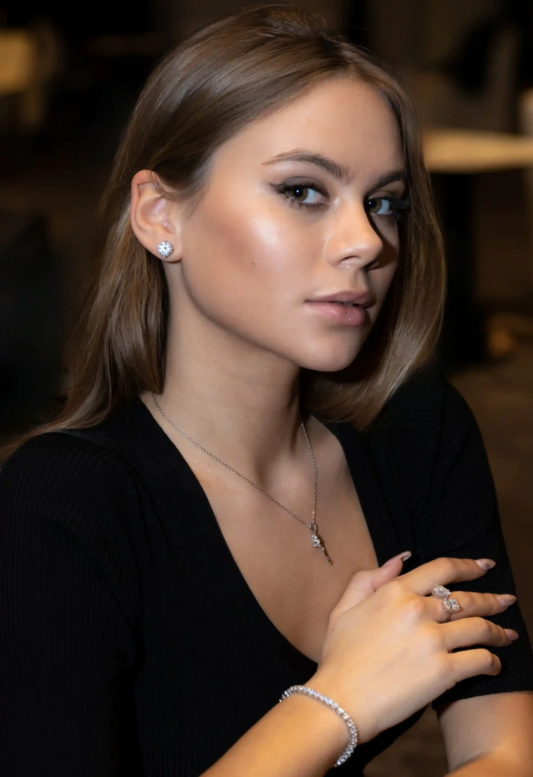 Les boucles d’oreilles Lumibella, ornées de pierres rondes de 1,5 carat chacune, capturent la lumière avec une intensité hypnotique et offrent un éclat comparable à celui des diamants les plus précieux. Chaque mouvement transforme ces boucles en un véritable spectacle de luxe et de sophistication.