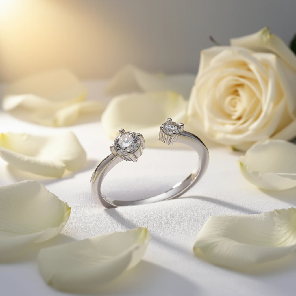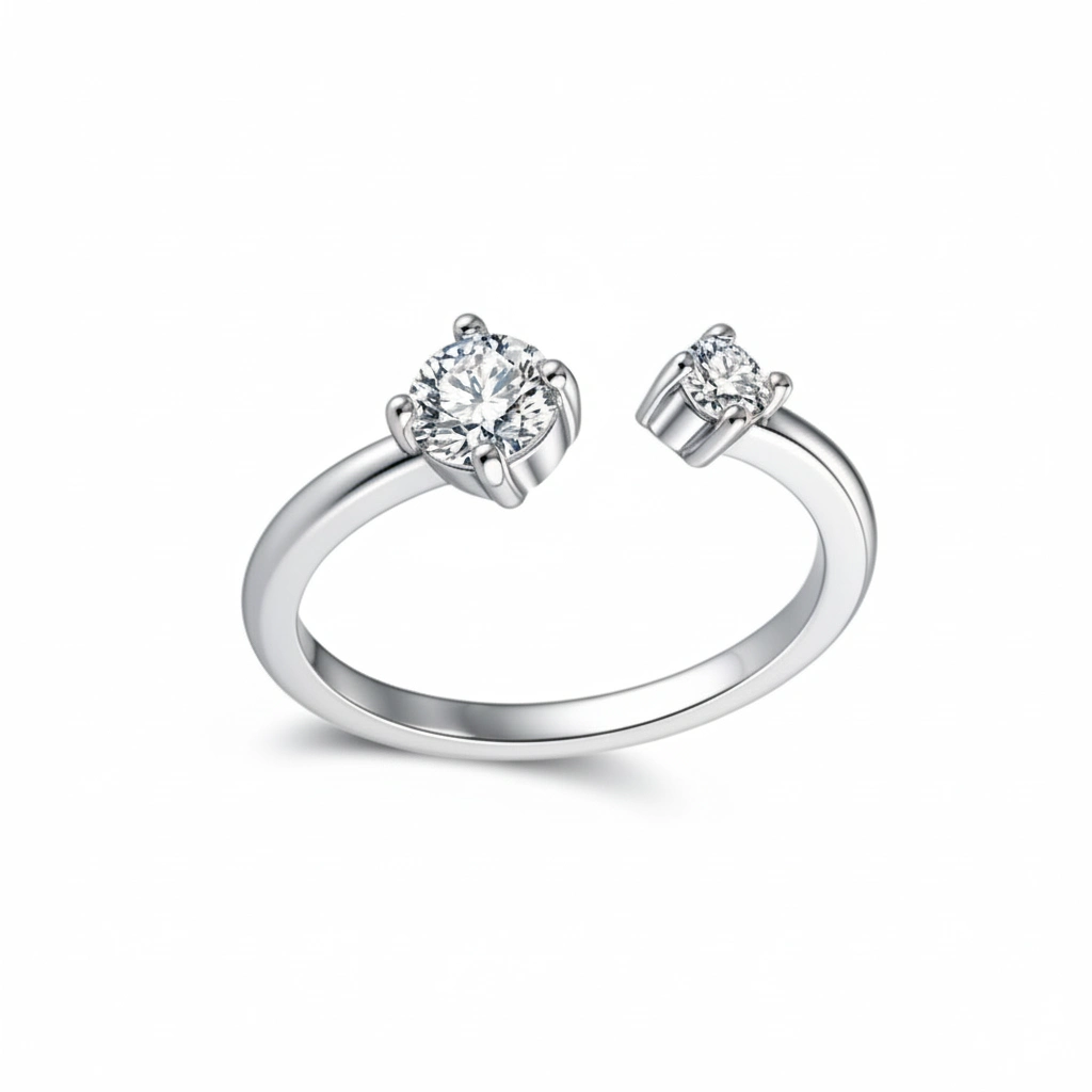 Sa ligne ouverte enlace le doigt avec une grâce architecturale, laissant la lumière circuler librement entre ses deux extrémités serties de pierres éclatantes. Chaque facette capte l’éclat avec une précision saisissante, créant un dialogue lumineux, pur et magnétique.